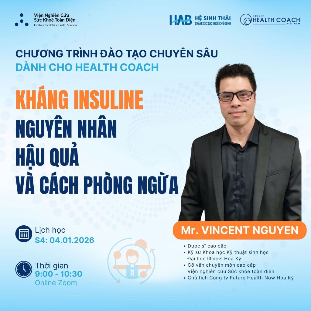 Kháng insulin không chỉ là nỗi lo của người bệnh tiểu đường mà còn là “gốc rễ” của hàng loạt rối loạn chuyển hóa hiện đại. Nhằm trang bị kiến thức khoa học vững chắc cho cộng đồng Health Coach, chương trình đào tạo chuyên sâu tháng 1 chính thức quay trở lại với chủ đề: Kháng Insulin – Nguyên nhân, Hậu quả và Cách phòng ngừa.